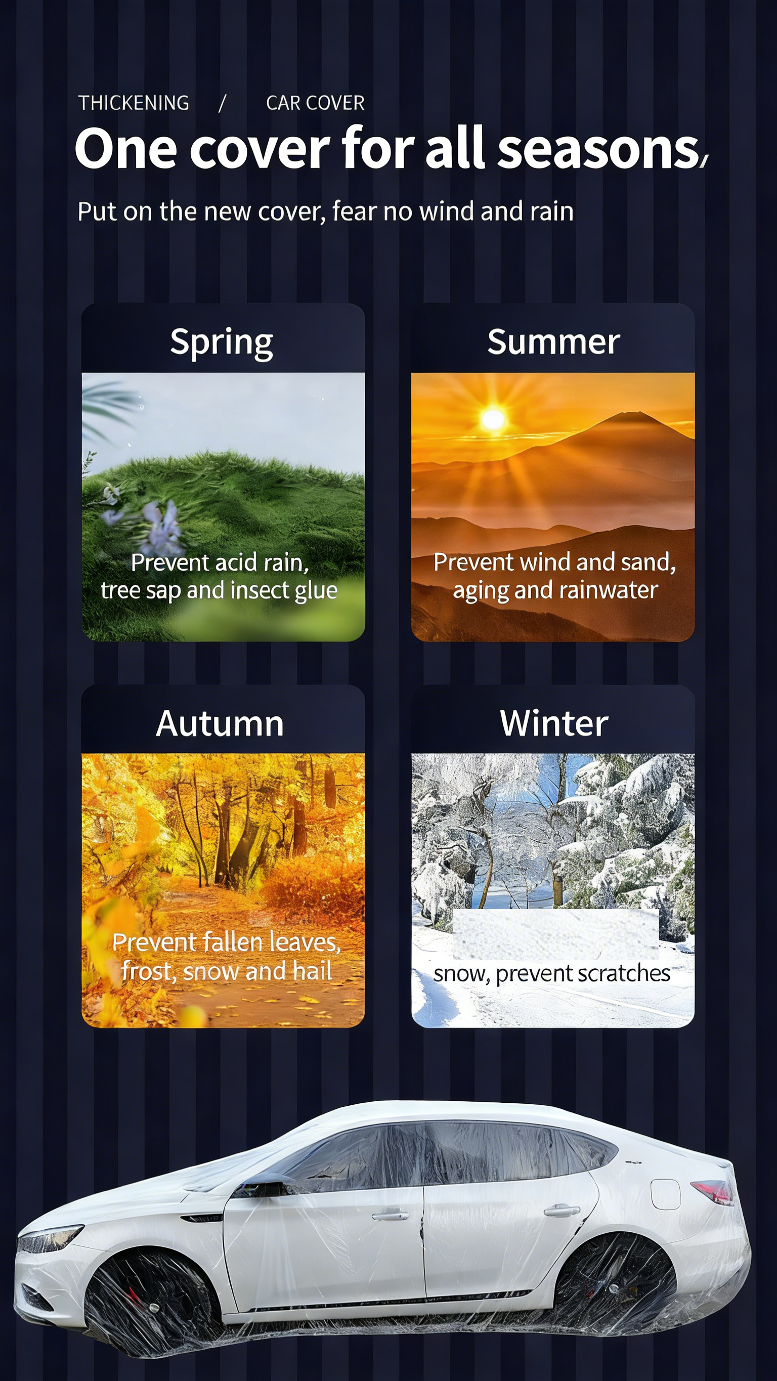 **Instructions for Use** Unfold the car cover to completely cover the vehicle, ensuring a tight seal. For outdoor use, reinforce the edges to prevent wind damage.