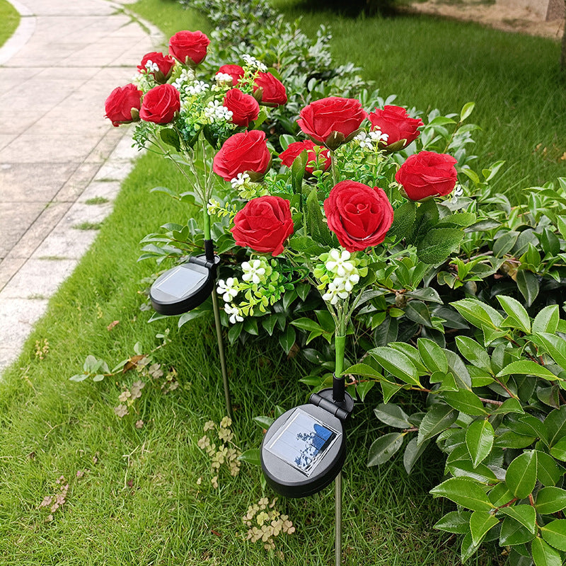 This product is a 7-head solar-powered rose ground insert light, specially designed for outdoor decoration. The light body is 70cm high, made of silk petals, stainless steel ground insert, and PVC material, with a beautiful and durable simulated rose design.