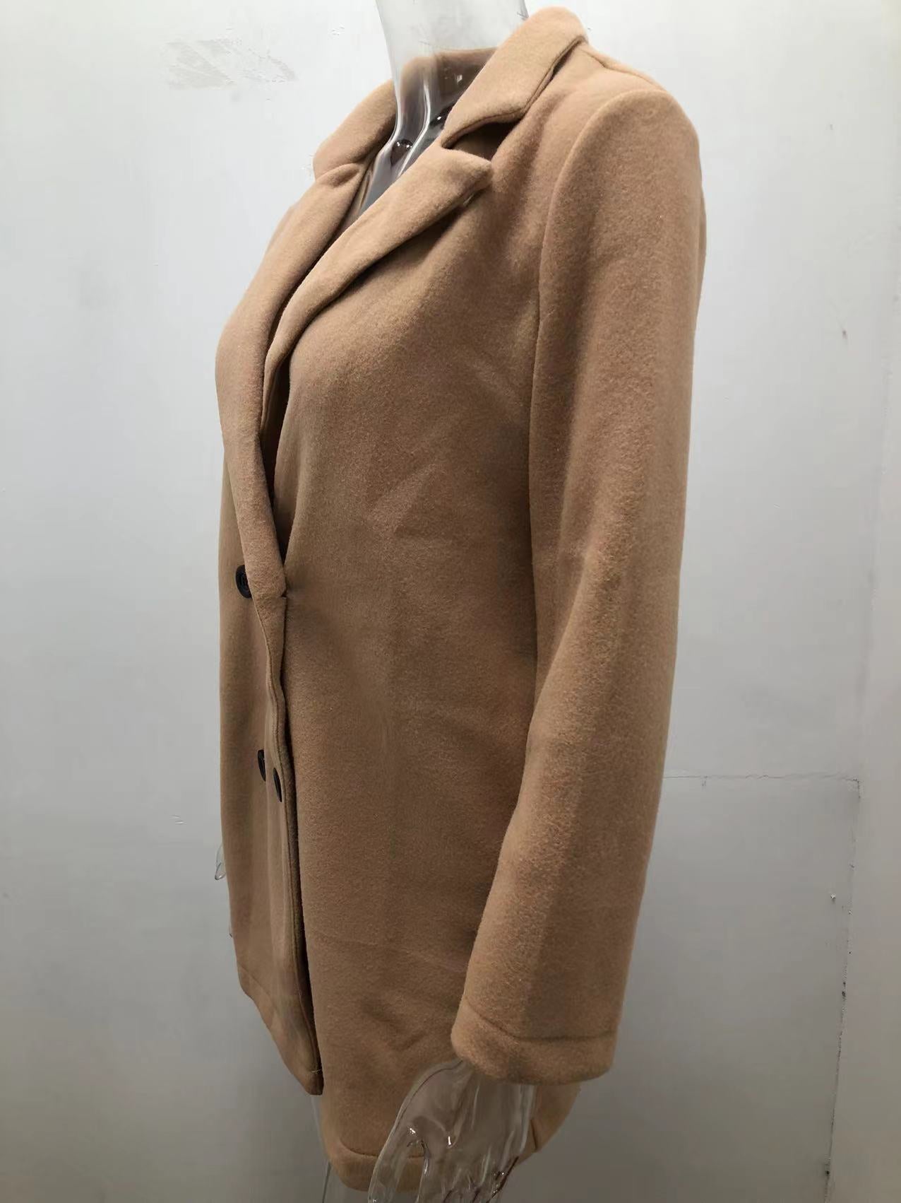 **Solid Color Double-Breasted Wool Coat for Women (Multiple Colors and Sizes, Suit Collar, Long Sleeve)**